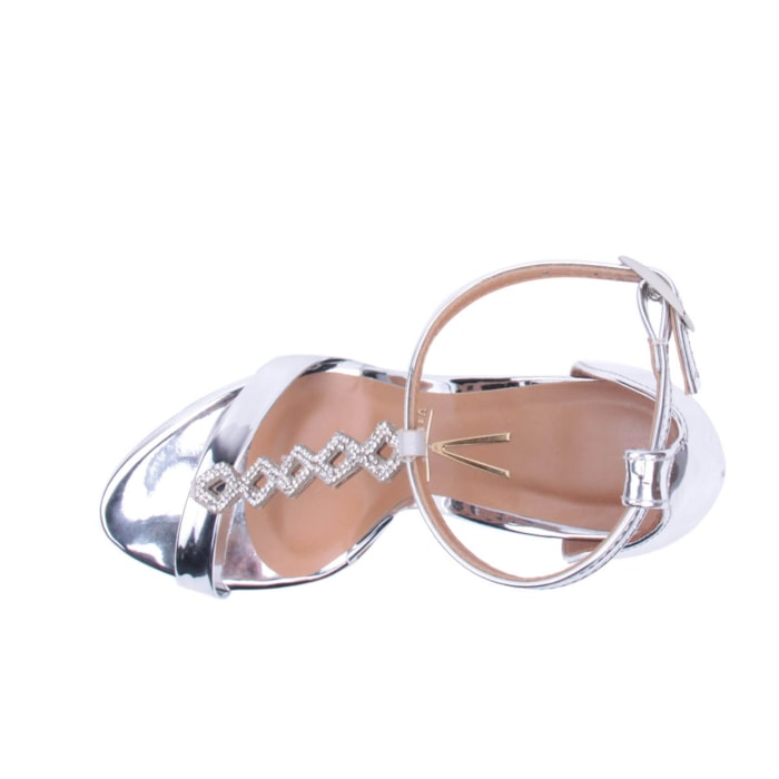 Sandália de senhora com ligamentos metalicos, da marca Vizzano. Disponivel em prateado.