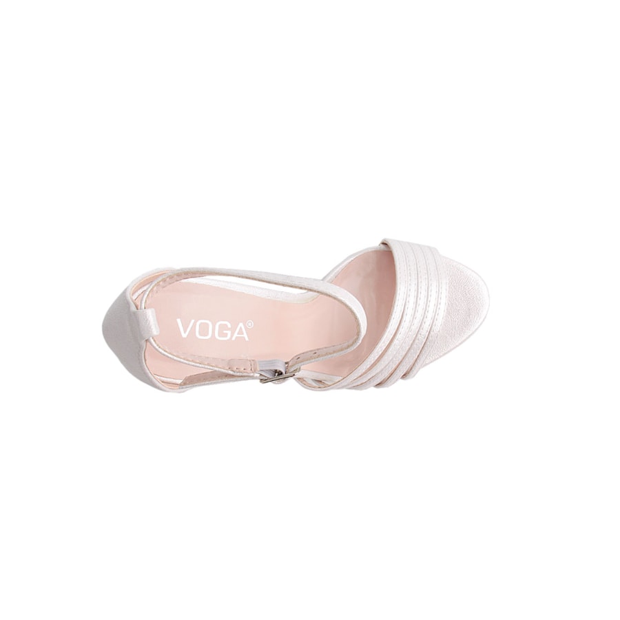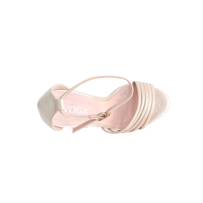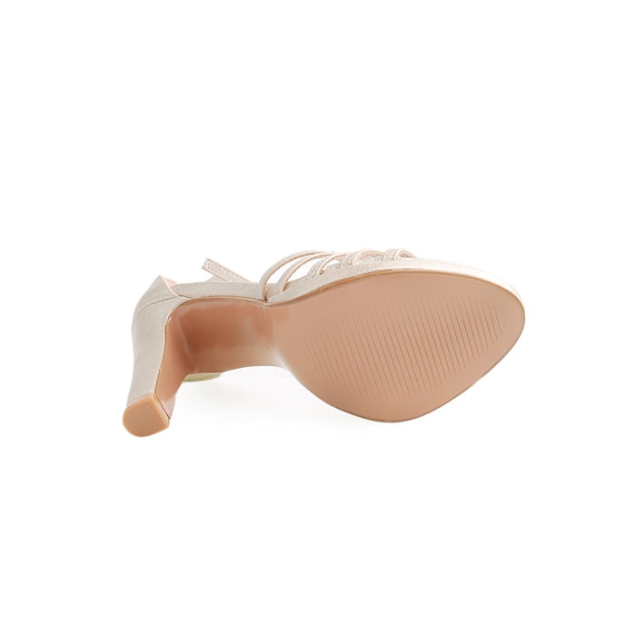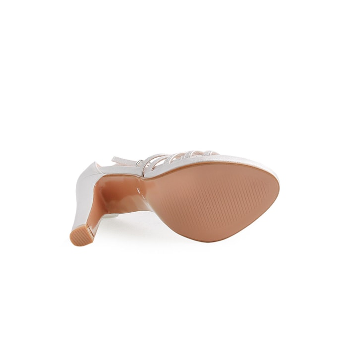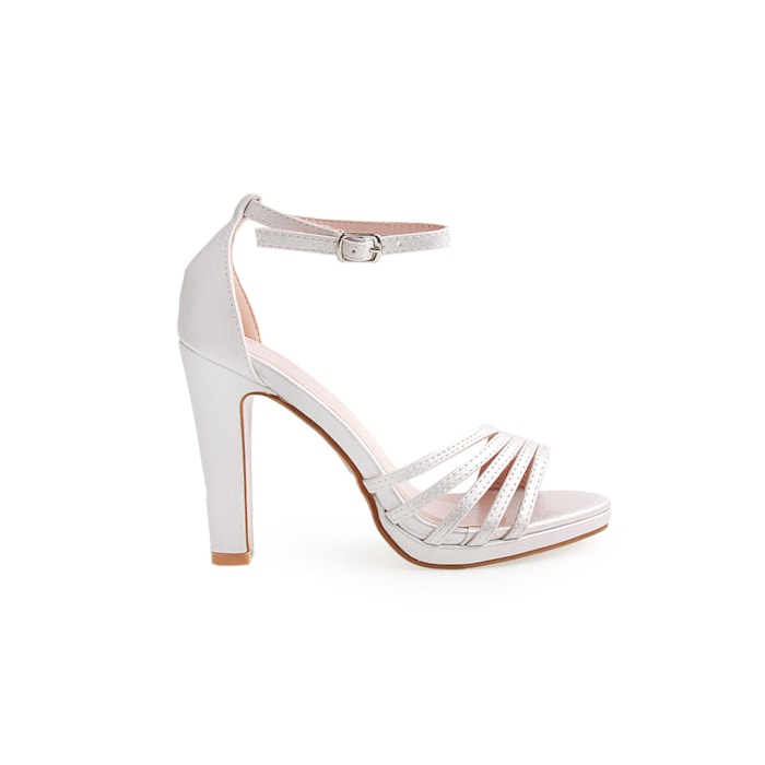 Sandália para senhora com efeito brilho. Salto com 11cm de altura. Disponível nas cores prateado e dourado.