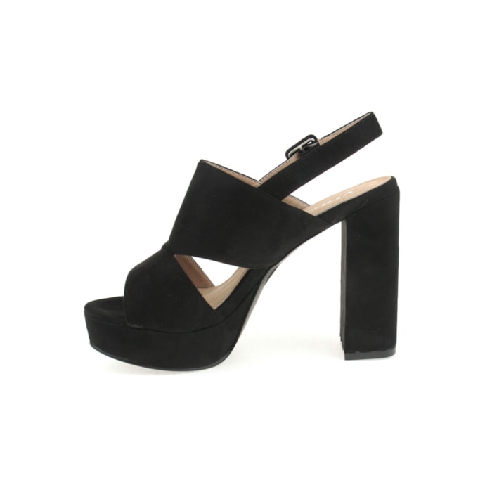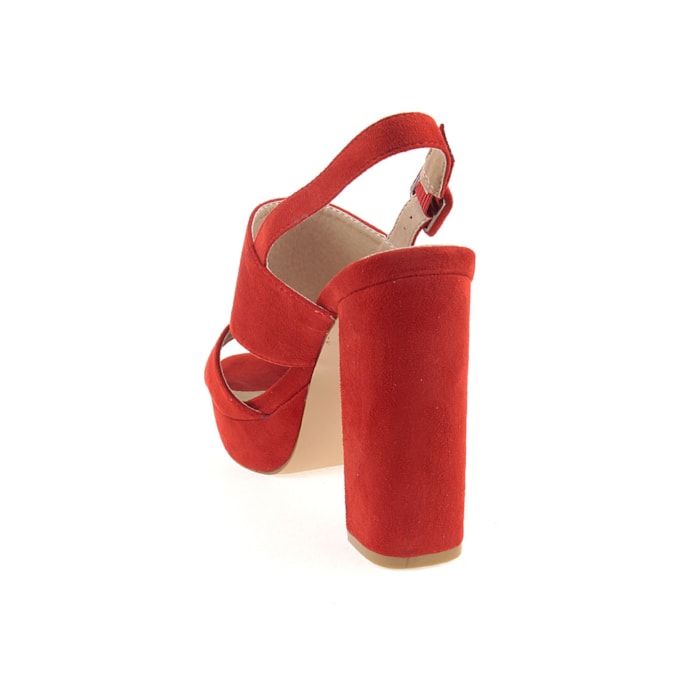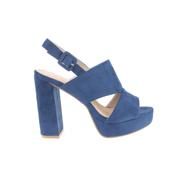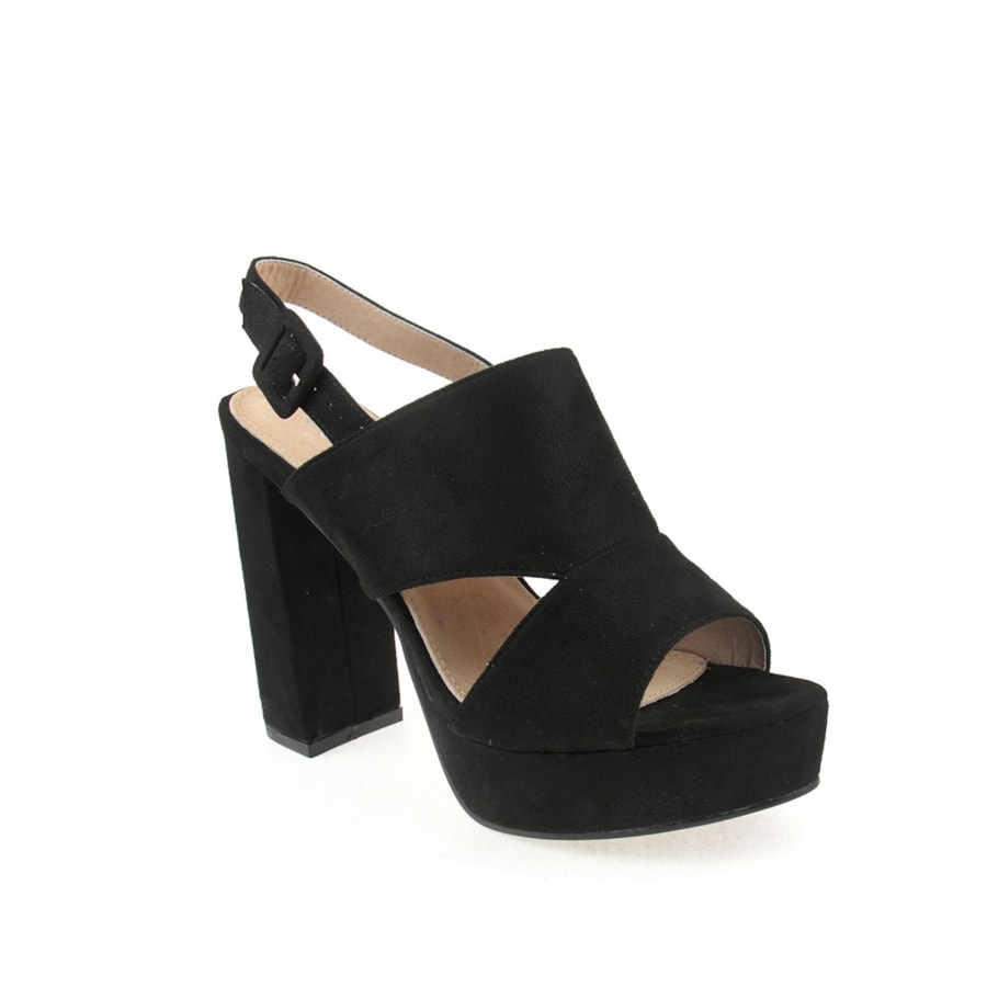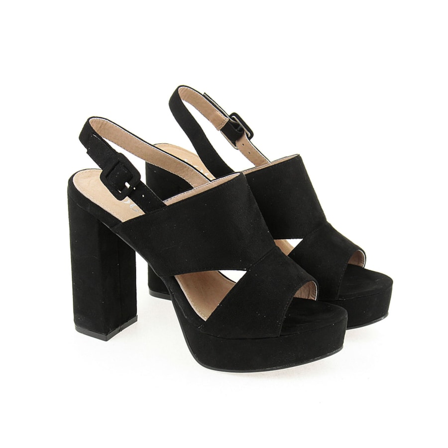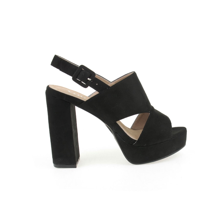 Sandália para senhora em veludo com salto compensado. Salto com 12cm de altura e compensado com 2,5cm.