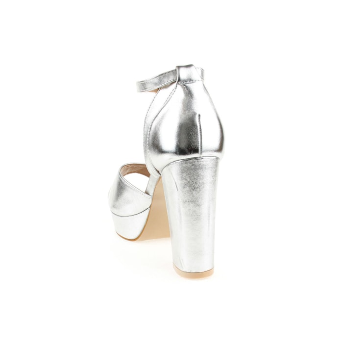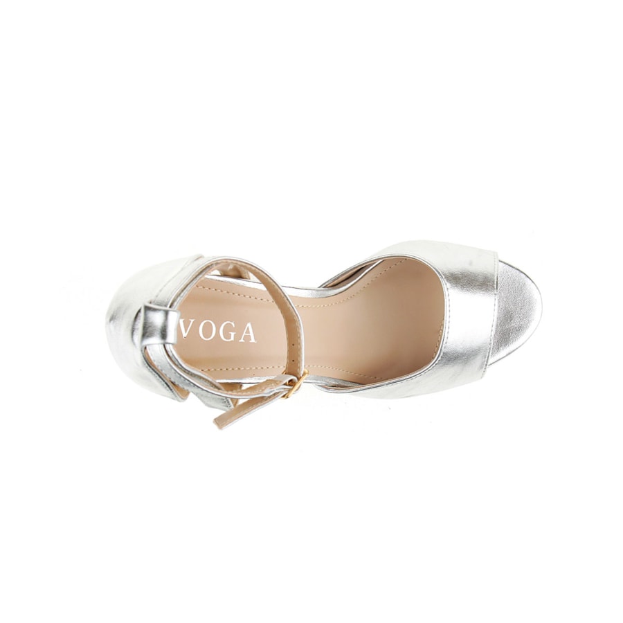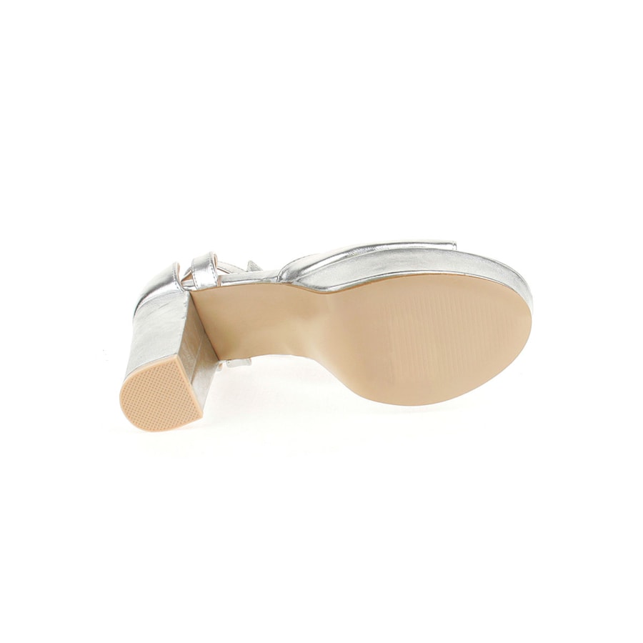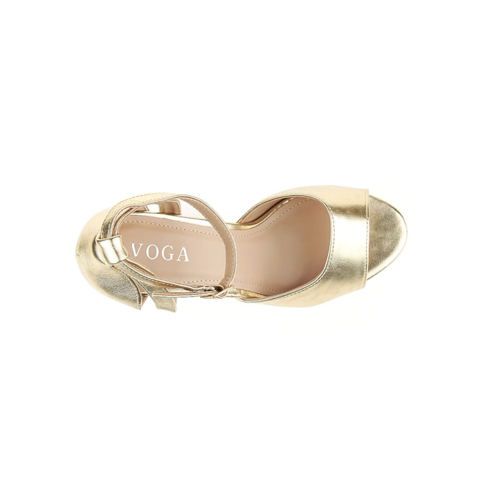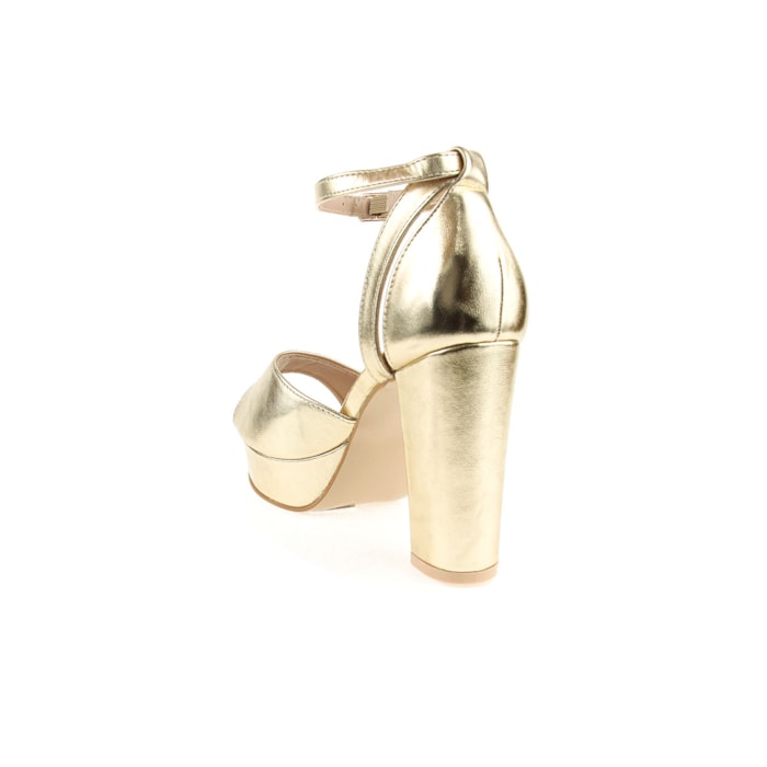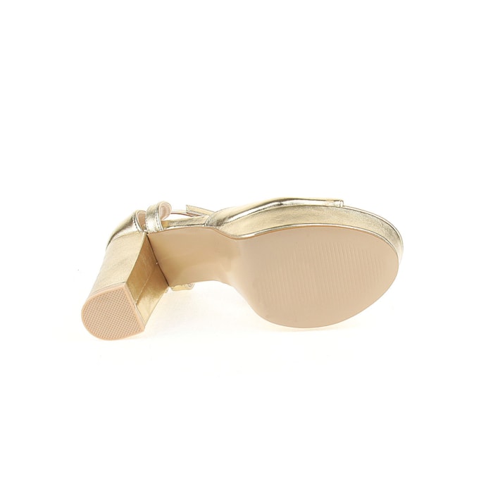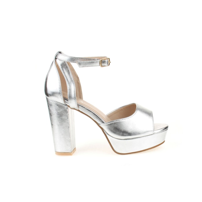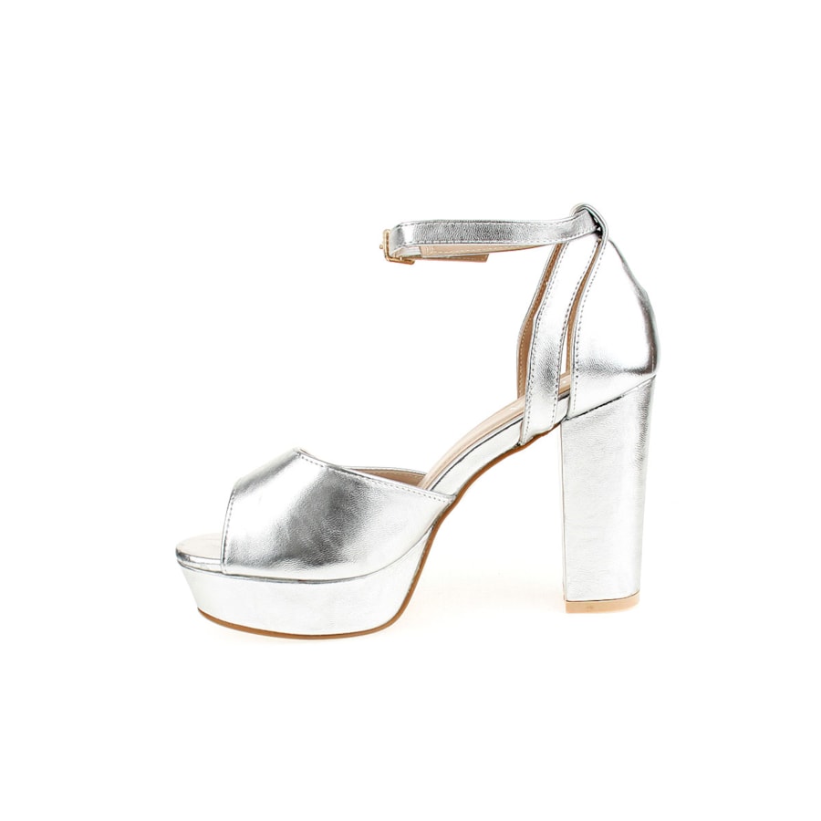 Sandália de senhora com salto compensado. Salto com 11cm de altura. Disponível nas cores dourado e prateado.