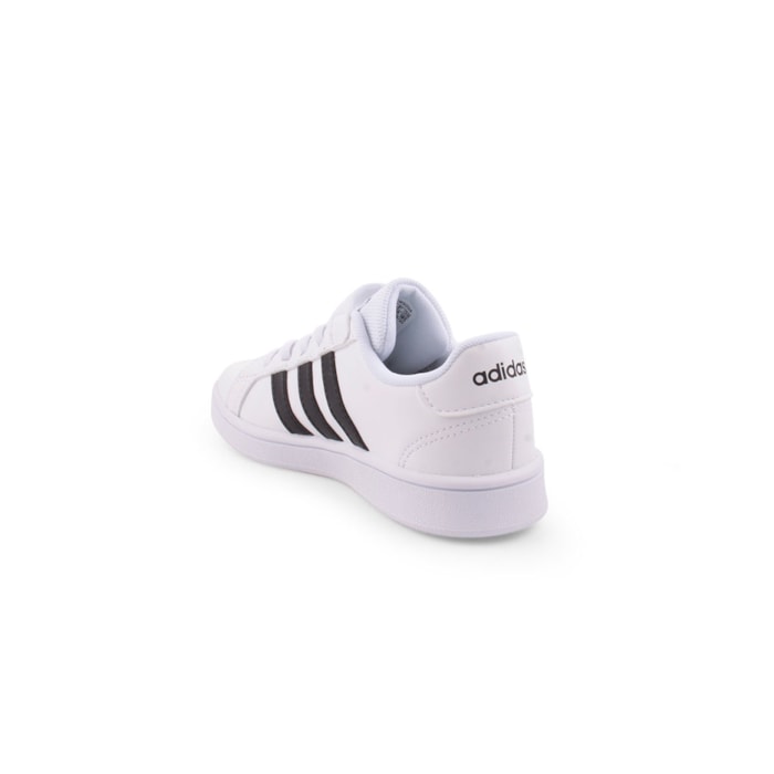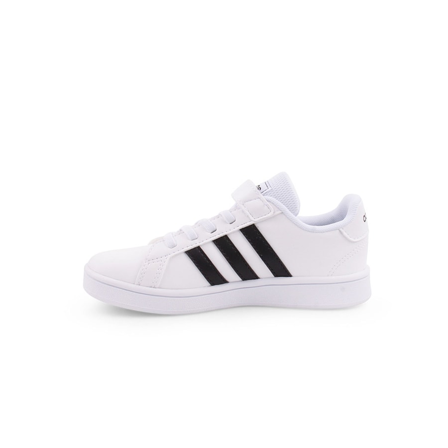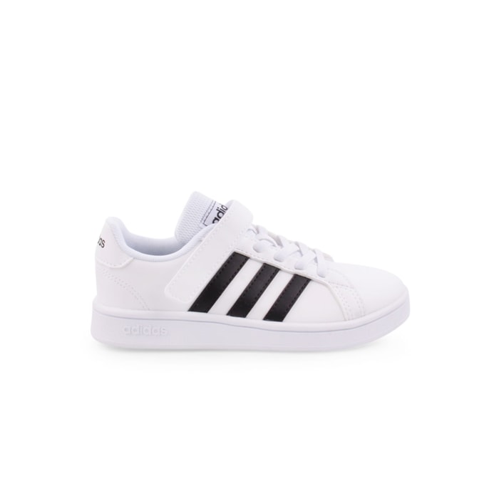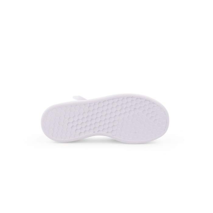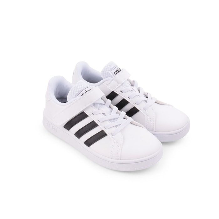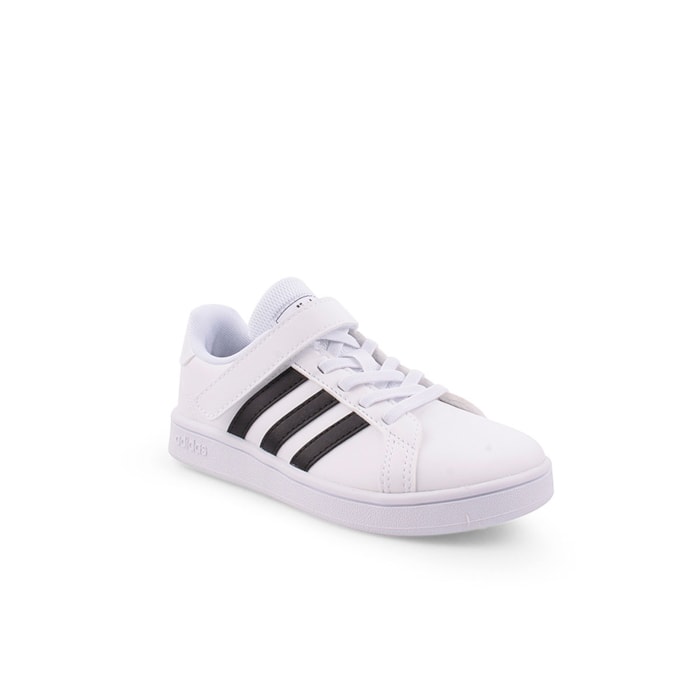 Os ténis adidas Grand Court 2.0 com velcro infantil apresentam cordões elásticos e uma fita de velcro para ser fáceis de calçar e descalçar. A sua parte superior em couro sintético e resistente ao desgaste permite-lhe brincar, chutar e saltar poças sem se preocupar. A parte superior contém pelo menos 50% de materiais reciclados. O seu objetivo é fornecer mais uma solução para ajudar a eliminar os resíduos plásticos.